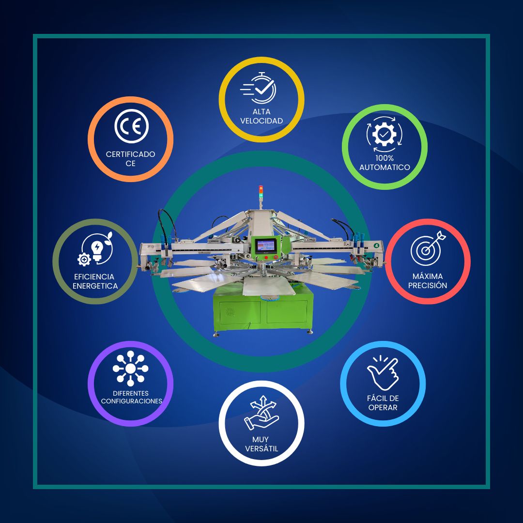 Esta pulpo es adecuado para la impresión en camisetas, sudaderas y tejidos, con secadores flash automáticos incorporados. Capacidad máxima de impresión: entre 600 y 1000 piezas por hora. Toda la máquina utiliza un sistema de accionamiento con servomotor. Es una combinación de uso neumático y eléctrico, con pantalla táctil PLC. El accionamiento de la máquina es por servo; el raspado de ida y vuelta también se realiza con servomotor; el movimiento de subida y bajada del rascador es neumático. El resto del sistema está totalmente controlado por servomotor. Hay diferentes configuraciones disponibles.